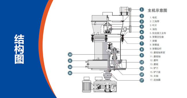 鋁礦石磨粉機內部結構比較簡單,主要由主機、電機、鼓風機、分析機、管道裝置等幾部分組成,其中主機作為該設備的主要部件,又包括了磨輥、磨環、鏟刀、進風蝸殼、機架、罩殼等。